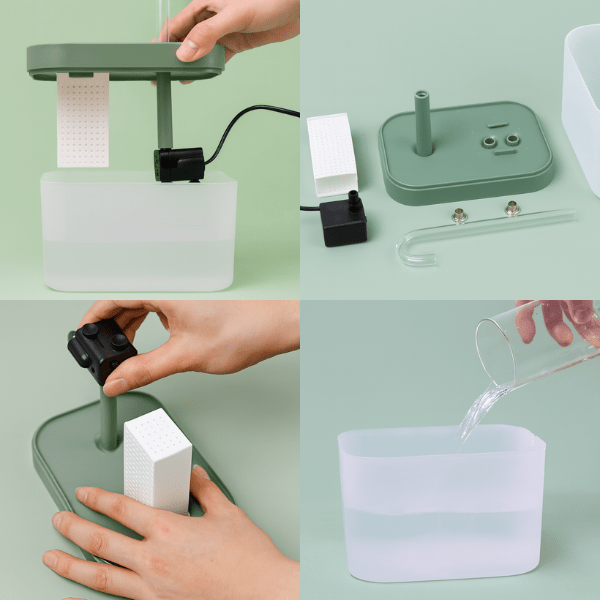 Pompe ultra-silencieuse (< 40 dB), consommation faible via USB, 3 débits réglables, sécurité anti-surchauffe et entretien simplifié en 3 étapes pour 1 à 3 chats.