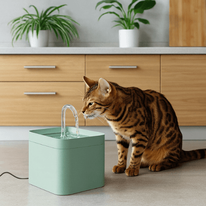 Fontaine à eau chat Verte : touche nature qui s’intègre aux cuisines et salons, idéale pour encourager les chats curieux à boire plus avec son robinet visible.